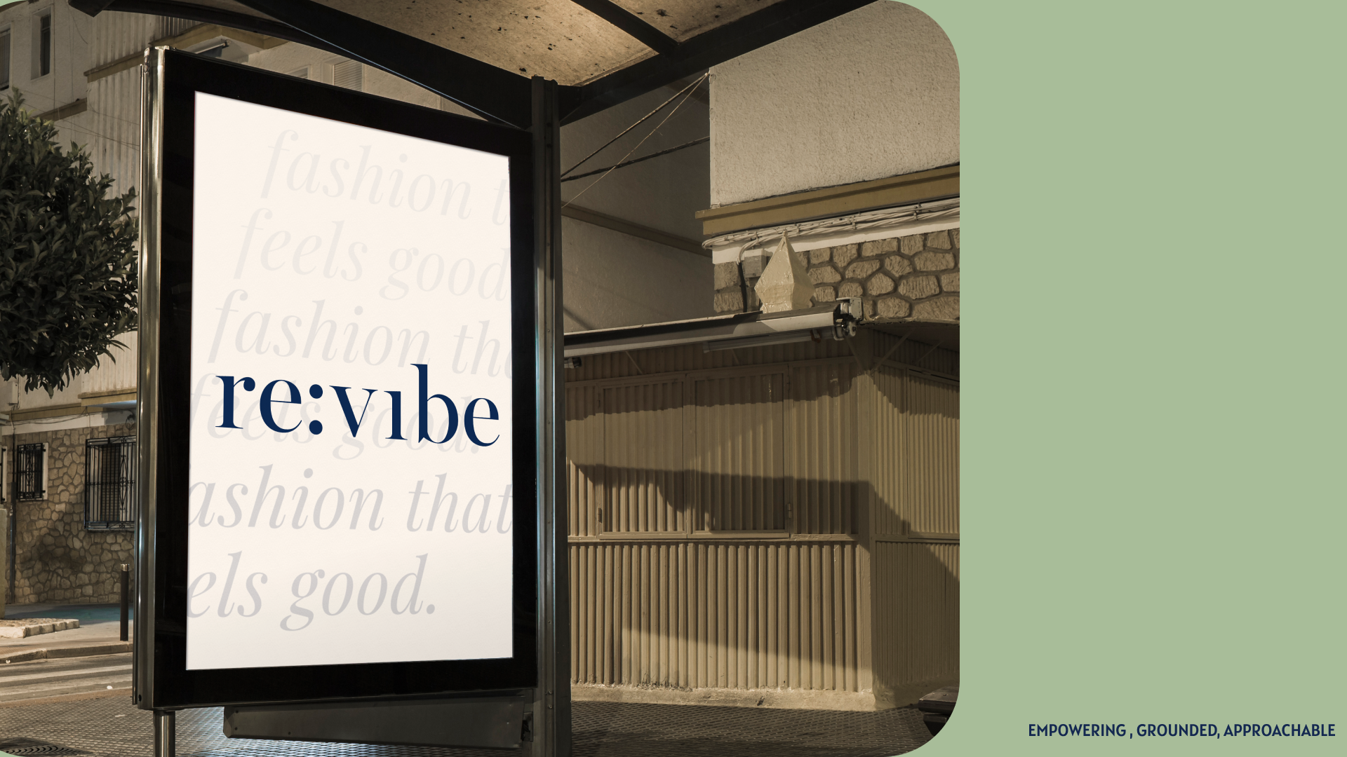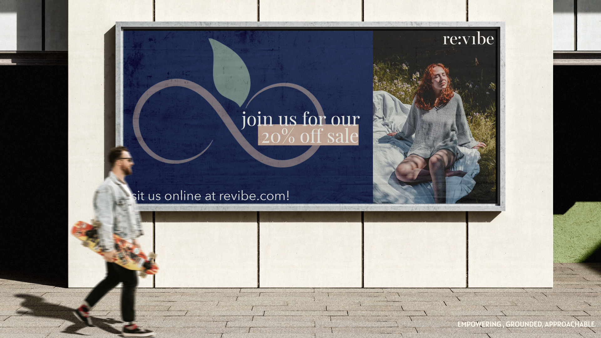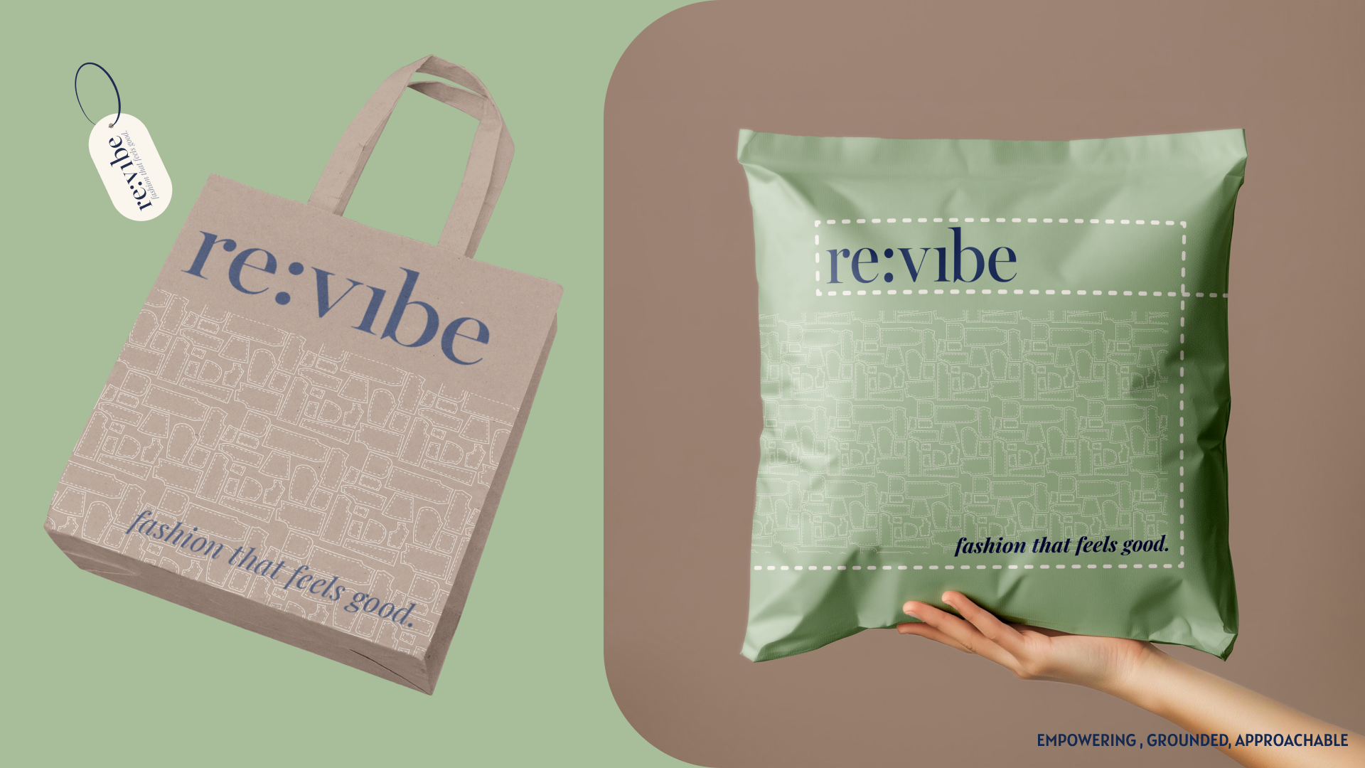 - branding and marketing -re:vibe is a brand identity exploration with the help of three other designers: Skylar Ward, Ella Rogge, and Grace Bligh. we were able to create a up-cycled clothing brand from the ground up tackling the challenges that include audience targeting, logo design, marketing, and real world design strategy.