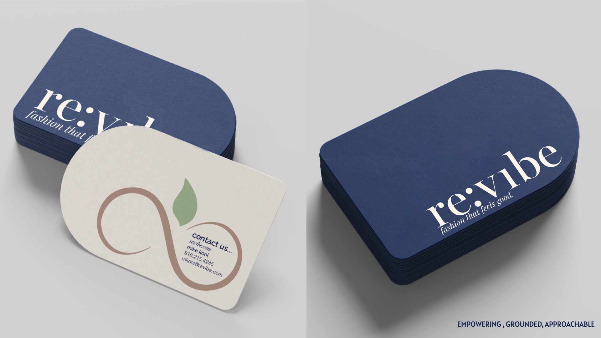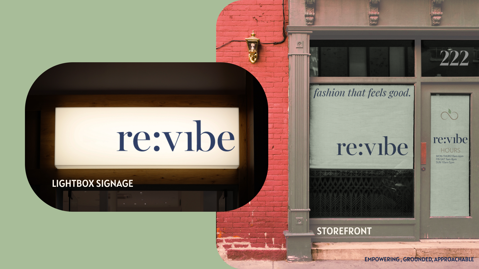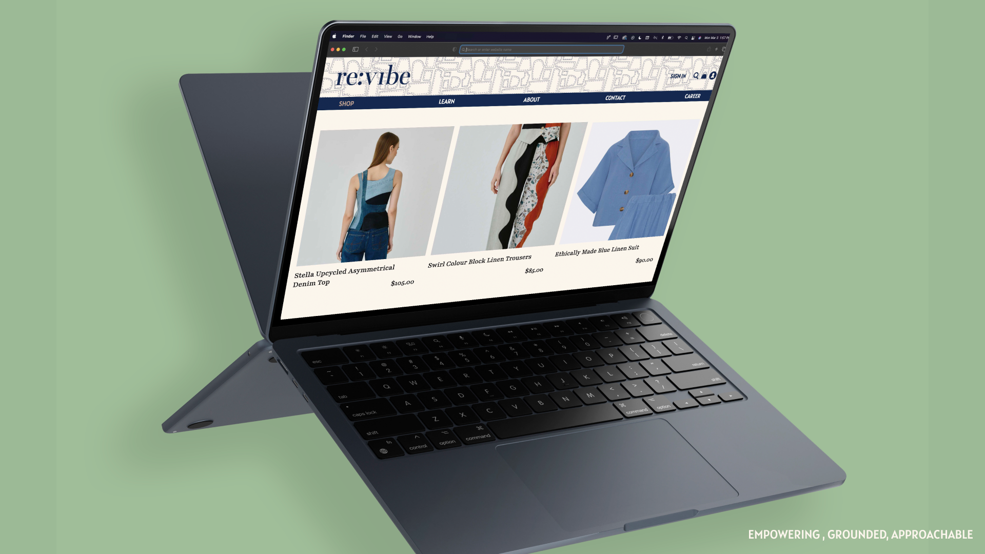 - branding and marketing -re:vibe is a brand identity exploration with the help of three other designers: Skylar Ward, Ella Rogge, and Grace Bligh. we were able to create a up-cycled clothing brand from the ground up tackling the challenges that include audience targeting, logo design, marketing, and real world design strategy.