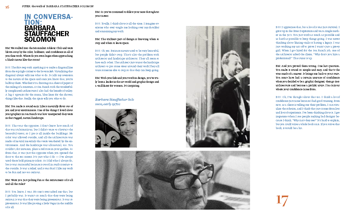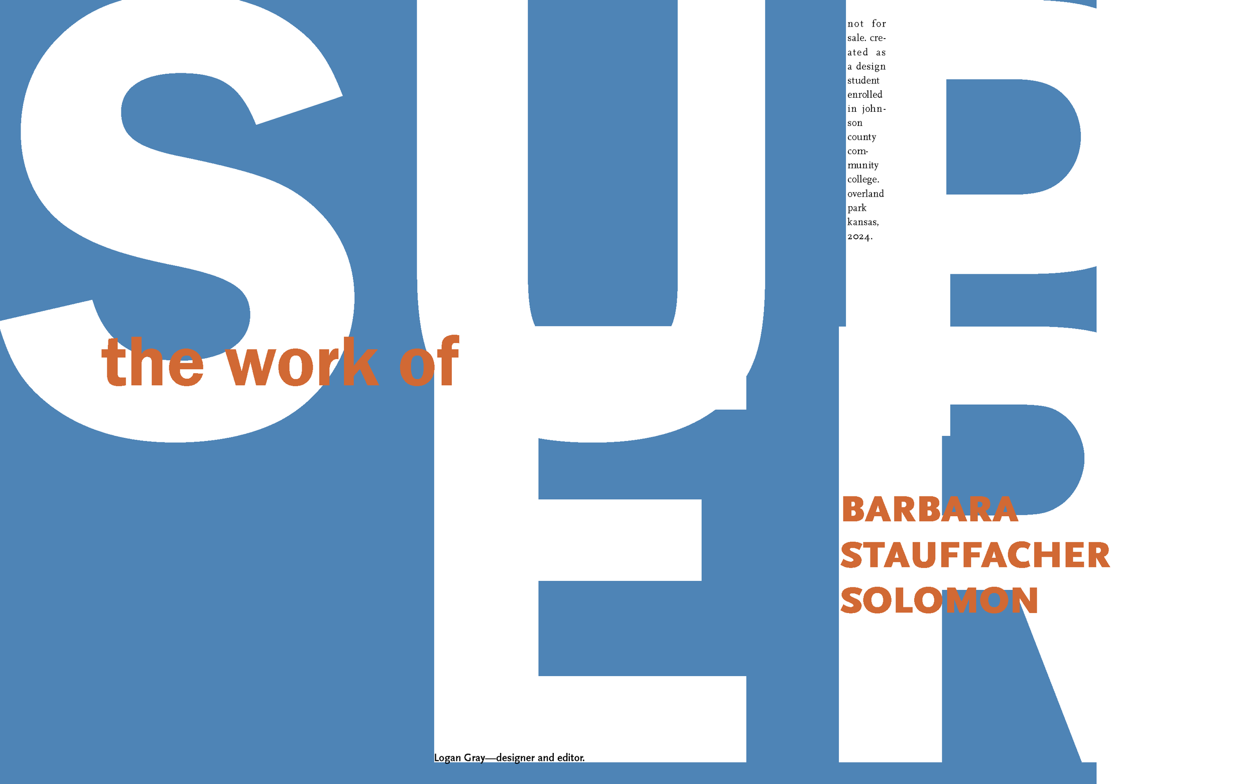 - book layout -super is a book layout design experiment focusing on the life of the popular graphic designer and visual artist Barbara Stauffacher Solomon. focusing on the timeline of her works as well as the intricate detail alongside interviews of her recount of her process.